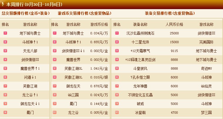 本周(延迟一周,时间为9月30日-10月6日)网游总交易排行:本周是国庆长假,各游戏交易额均有一定程度的上升,DNF依旧保持第一,国庆龙族礼包开卖,里面不仅包含各职业华丽的龙族之血统套装,更有强属性魔法称号,以及龙族宝珠、染色道具等等。(via腾讯游戏频道)