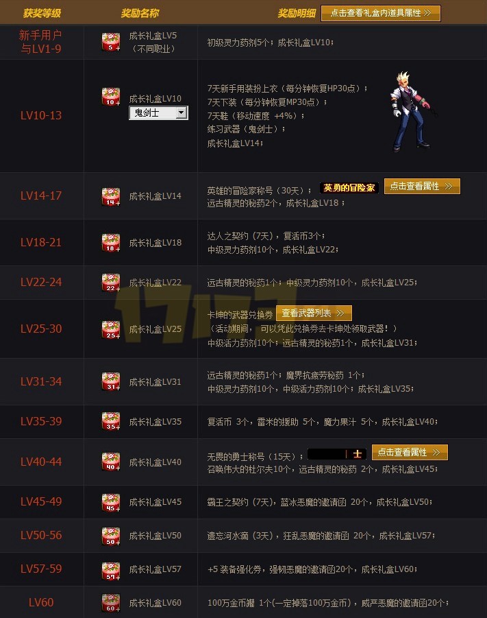 这个活动大概是老玩家们津津乐道的给力活动之一了。在2010年12月,国服开始了这个活动,所有角色无论大号小号,无论1级还是60级,都可以通过升级获得系统赠送的各种福利,LV60级的时候还能获得大量深渊入场券+100W金币。而值得一提的是,这个活动赠送的盒子是永久期限的,小编自己的小号上现在还有没开的礼盒。