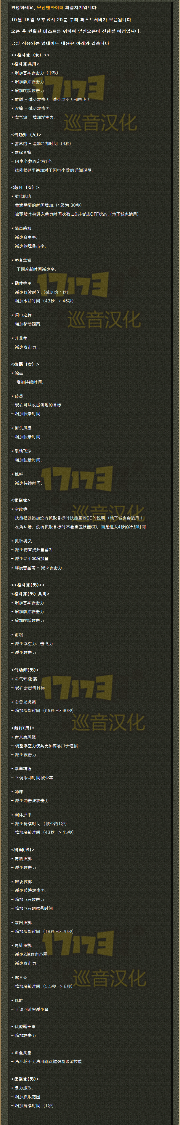 韩服在昨天开放了体验服测试,大致更新内容分为阿修罗,剑魂的技能平衡性改版(剑魂调整以光剑剑魂为主)、PK场伤害平衡性调整。目前汉化进度到阿修罗,剑魂的技能平衡性改版,PK场修改随后放出。