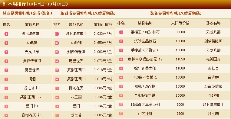 上周游戏币交易排名:游戏币交易排行榜与上周相比无变化,DNF维持第一位置,游戏第四季第三章续篇开幕,女鬼剑觉醒——剑宗、剑魔如约而至,并且新增多套装备。(编注:近期官方大力度打击工作室等非法收入大户,以及新增的强化活动,游戏币价格回升很快。以福建一区为例,游戏币由之前触底的1:40涨回1:30,并且有进一步上涨趋势。)