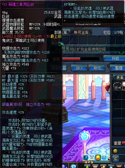 评论:鬼剑士85粉巨,金色刀身,冒着紫色斗气,相当美型,物攻1113,无视1218,并增加血蓝上限以及暴击率。武器特效为攻击附带12%额外伤害,并且在攻击时有5%几率消耗一个灵魂石,获得3种BUFF,红BUFF可以增加主属性和暴击,黄BUFF受攻击可以回血,紫BUFF增加10%攻速、施放速度和移动速度,非常炫的一把武器。