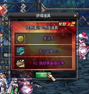 60个礼盒获得双倍+12装备强化券(低级的),然后随意对镇魂武器使了一张,果断成功了!如此底的几率都成功,可以买个彩票了吧?