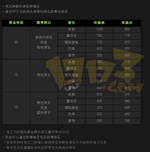 除了骷髅骑士拳套(三攻领主粉左槽)外,其他所有的领主神器BOSS粉装备兑换所需要的陨石数量全部降低。