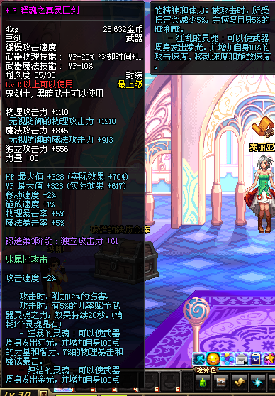 评论:鬼剑士85粉巨,金色刀身,冒着紫色斗气,相当美型,物攻1110,无视1218,并增加血蓝上限以及暴击率。武器特效为攻击附带12%额外伤害,并且在攻击时有5%几率消耗一个灵魂石,获得3种BUFF,红BUFF可以增加主属性和暴击,黄BUFF受攻击可以回血,紫BUFF增加10%攻速、施放速度和移动速度,非常炫的一把武器。