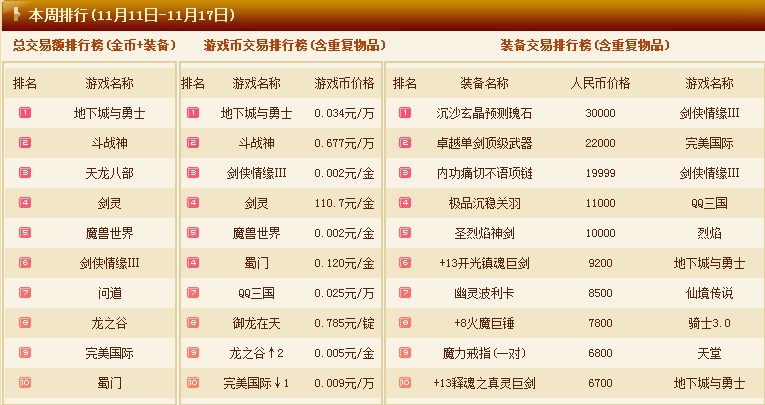 数据来源:5173,出自:腾讯游戏频道(编注:榜单中+13开光镇魂巨剑和+13释魂之真灵巨剑为同一把,但交易大区不同,价格也不相同。)