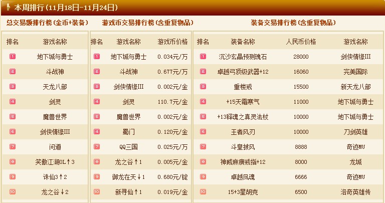 数据来源:5173,出自:腾讯游戏频道。本周排行(11月18日-11月24日):dnf凭借85版本最受欢迎的两把武器:天霜寒气和镇魂武器(释魂武器)交易一直在网游交易榜中名列前茅。