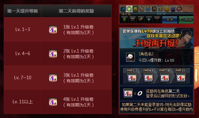 12月10日至12月24日,超多升级券,等你来拿!活动介绍:活动期间,拥有lv70以上角色的玩家,帐号内所有lv79以下的角色,只要等级提升,即可在次日获得升级券!