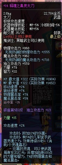 评论:鬼剑士85粉太,最新也是最强的武器,冒着紫气的刀神非常华丽。强化14,物攻876,魔攻970,物理无视和魔法无视更是高达1555和1718。独立攻击545,力量79,智力112。特效为额外增加HP MP最大值,增加移动速度、施放速度和暴击率。四种不同的灵魂可以触发4种不同的战斗特效。
