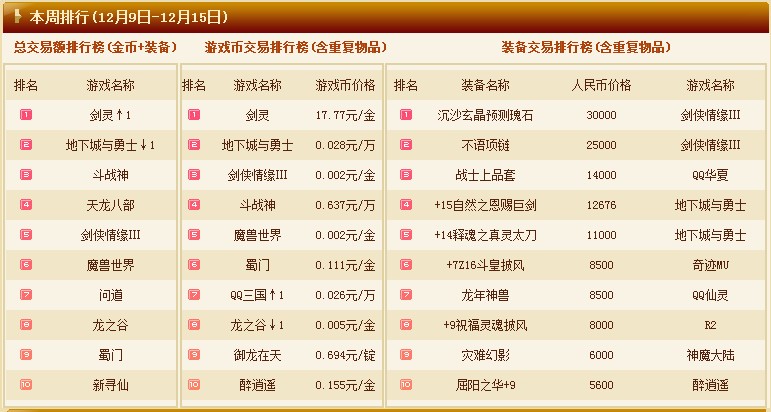 本周网游总交易排行:DNF没有承受得住猛烈攻势,罕见的滑落到了第二的位置,保持数年的金身被本周继续爆发的《剑灵》所破。而DNF的游戏币交易额也滑落至第二的位置,相当的罕见。