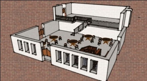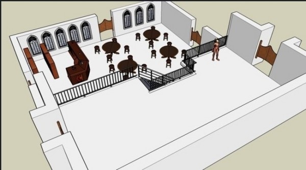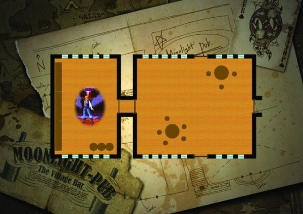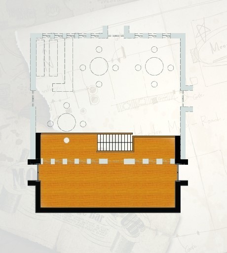 再来分析酒馆的结构吧:中间的楼梯,说明是多层结构,根据后方的酒架桌子摆放方位,大概结构是这个样子的: