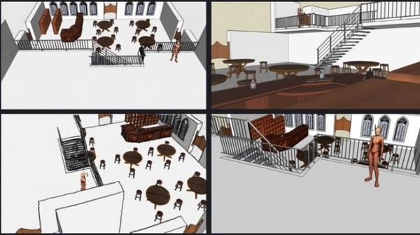 一个屏幕的像素肯定是不够的,那么楼主将图拼起来。很明显的看到中央为楼梯式结构,进门即可通往下方的酒吧环境。