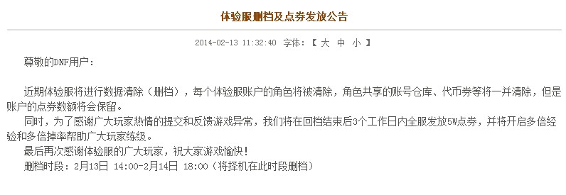 近期体验服将进行数据清除(删档),每个体验服账户的角色将被清除,角色共享的账号仓库、代币券等将一并清除,但是账户的点券数额将会保留。