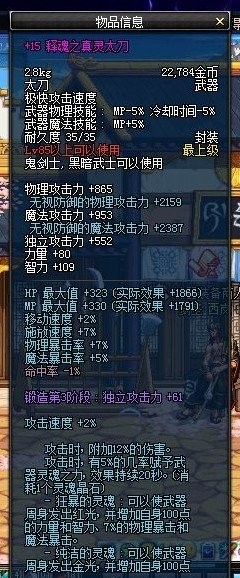 评论:鬼剑士85粉太刀,强化15层,物理无视2159、魔法无视2387,独立攻击552,锻造第三段独立攻击+61,额外力量80。攻击时附加12%的伤害。纯洁的灵魂可以使武器周身发出金光,并增加自身100点的力量和智力、7%的物理暴击和魔法暴击,能强化到15层只能说人品爆表!