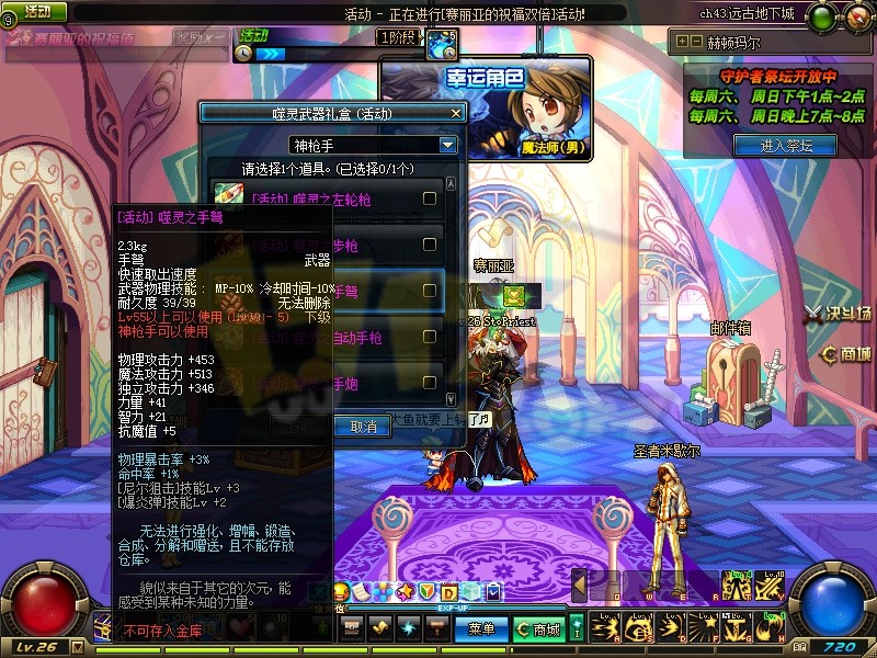 每日上线时均可收到LV60的粉武器礼盒,粉武器持续时间24小时。