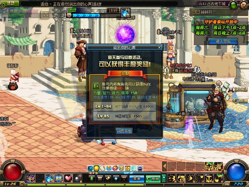 每日参与调查问卷,可以得到角色属性增强(LV1-84)和神器掉率增加(LV85)的各类BUFF。