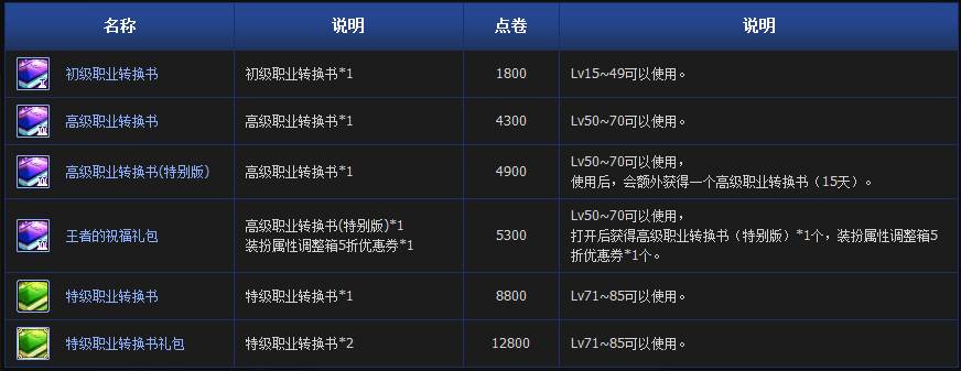 5.5月27日版本更新后,特级职业转换书将会下架;初级和高级的职业转换书将会继续出售。