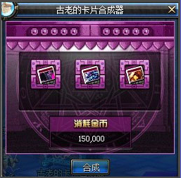 点击卡片合成器后,会出现古老的卡片合成桌,放入三张同一等级的卡片以及一定数量的金币可以合成新的宝珠,合成新宝珠的等级有一定的几率在原有卡片的等级上提升一级。