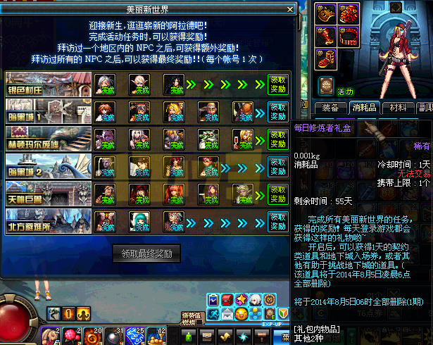 美丽新世界活动最终奖励可领取,每天可开启一次,开启后获得道具+契约1天+任意远古门票随机两个。