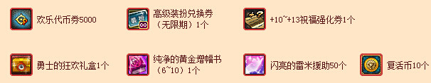 2. 【+10~+13祝福强化券】、【勇士的狂欢礼盒】、【神圣的黄金增幅书】将于2014年7月31日凌晨6点统一删除,【欢乐代币券】将于2014年8月5日凌晨6:00统一删除;