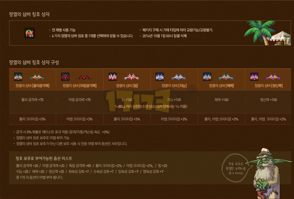 物理攻击+75 物理暴击+3% | 魔法攻击+75 魔法暴击+3% | 力量+100 物理暴击+3% | 智力+100 魔法暴击+3% | 体力+100 物理暴击+3% 魔法暴击+3% | 魔法+100 物理暴击+3% 魔法暴击+3% |