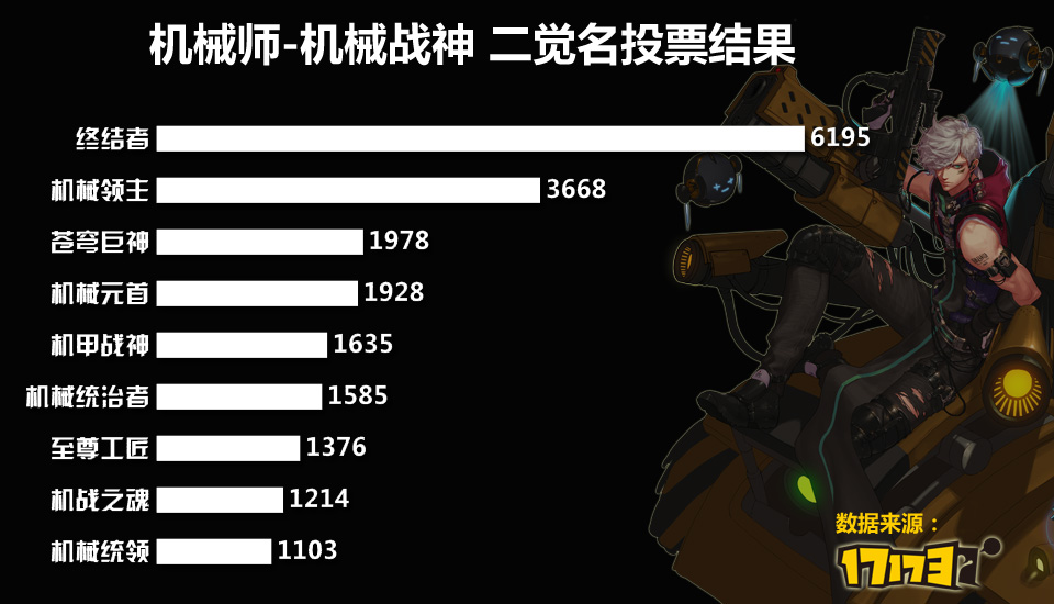 根据玩家投票和综合考虑,我们认为机械二觉名称的候选词是:终结者、机械**、至尊工匠。正式名称将可能从这三者中选出。