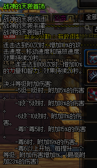 | 青龙雕纹斗篷 | Lv70 | 31 | *抗魔值+3 *装备后使自己进入伪装状态,并增加12%的物理/魔法暴击率,10%的暴击伤害,但是受到的伤害+20%,持续15s(CD30s) | [金色曲玉]*80(40天) | [青龙大会] |