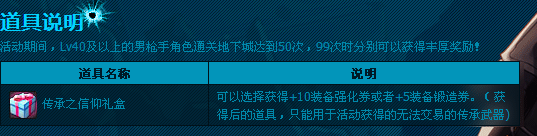 首先此方法只适用那些不准备升到55级打开传承之信仰礼盒的,因为不一定所有拿勇者套装盒子都是给男枪而是很可能是给自己主号。