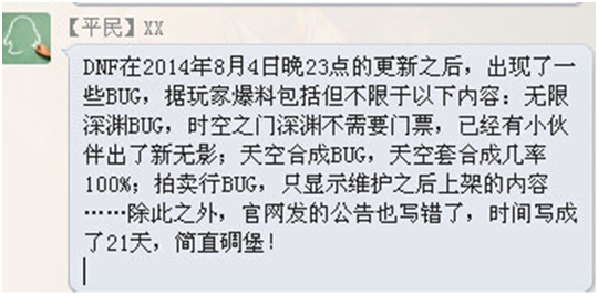 8月5日8点28分,DNF发布了临时维护的公告。出大事了!虽然说每次更新维护总会让我们遇上一些BUG什么的我们都已经习惯了,但是今天终于还是出大事了!这次临时工都帮不了你背黑锅了!