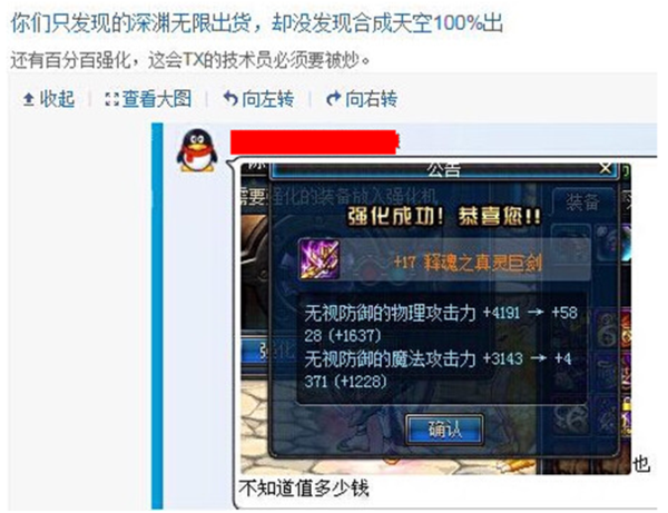 维护期间,不知道从哪里传来的小道消息开始接二连三铺天盖地的传播而来,什么强化100%成功啊,合天空100%出天空套啊!