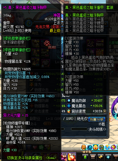 重甲职业的极限装备(无增幅效果的前提下)我认为就是75ss重甲套,加攻击的手套,全属性强化石头,遗迹手镯,灵魂猎者,75属强戒指(或者骨戒),这样搭配会不会很牛逼,战神套没用过,主要我不pk了,不知道效果
