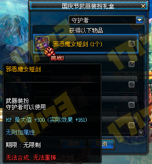 礼盒为账号绑定,打开后可选择对应职业的武器装扮1个,武器装扮属性为增加HP最大值