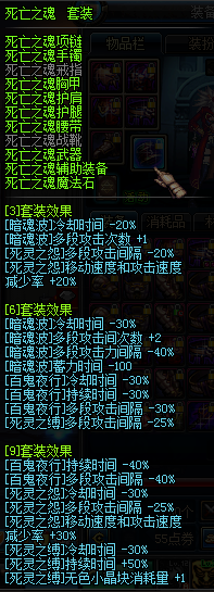 点评:怎么说呢,死亡之魂应该是死灵最好的异界套之一了,各种暗劲波很爽有没有?并且暗劲波加上多段攻击的百鬼夜行,会让你的操作相当具有打击感,很全面的装备。并且死灵之缚的提升也让死灵的操作更加具有技巧性,据楼主韩服测试,暗劲波的攻击力提升相当明显,不知道国服下版本会不会也提升攻击力。