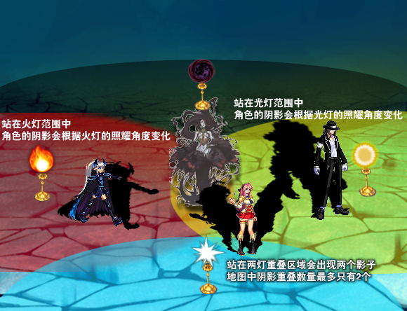 灯全亮后画面中的暗影全部清除,只留下玩家被灯台照亮后的影子,希洛克无法附影在地面中,只能附影在玩家的影子里,被附影的玩家,身后的影子是随时变化范围的。每盏灯点亮后出现一定范围的该元素属性的光亮,站在此灯光照耀的范围中,角色的影子会根据该灯的角度而变化。