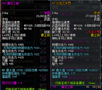 付费道具在PKC带来了太多的收益,首先是武器,我们看下面几张图,这些图属性全部为满属性,我们可以看到粉、传说、史诗。依次在PKC提升了10物攻属性(70以上的武器在PKC修正攻击相同,只受品级影响),而春节称号和SAO称号完全打破这一平衡。