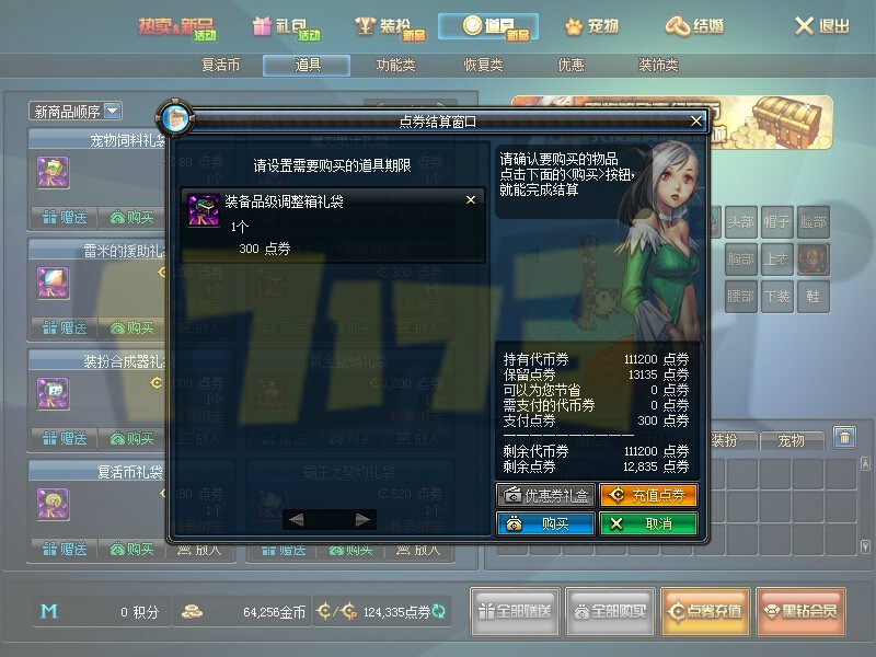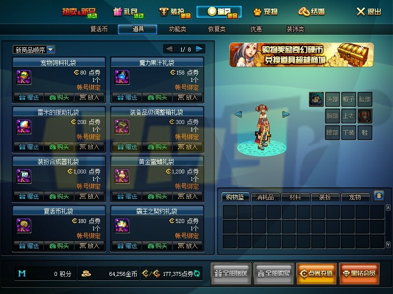 价格内容不变,但是,体验1服只可以使用点券购买礼袋,不可使用代币券!