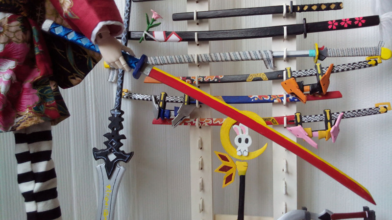 第1-2把亂做的刀,取名叫金角、銀角..........,3-4-5是兩把樓觀劍(其中一把未完成..花被姪女給要走了....),一把白樓劍,6-7-8-9是pso2的武器,武士刀-劍影、雙小刀....錦、朦、茜(刀子的等級擺錯了....),這幾把有空....會在到pso2版騙點gp