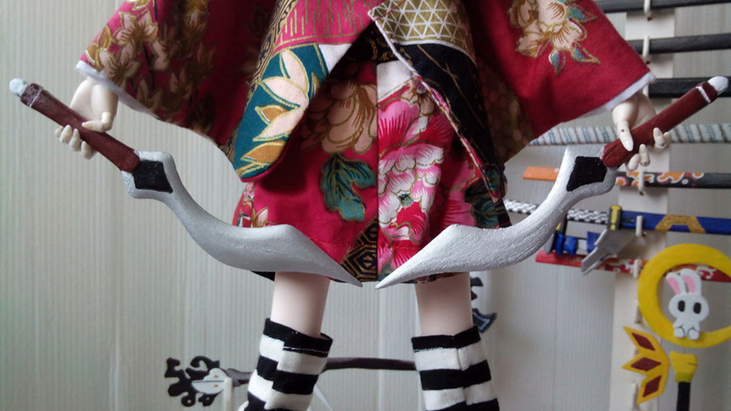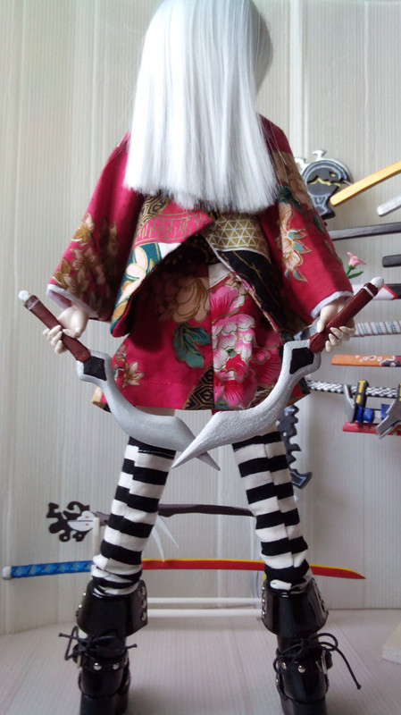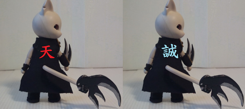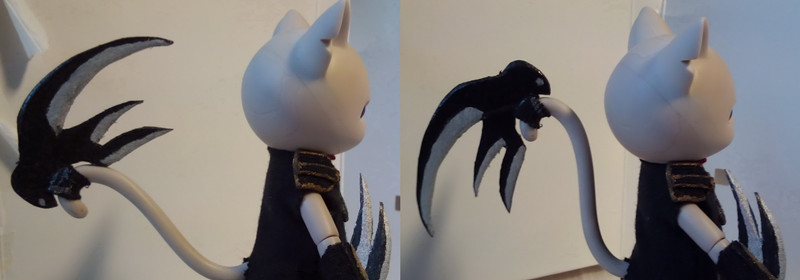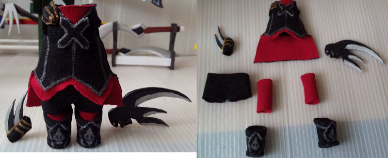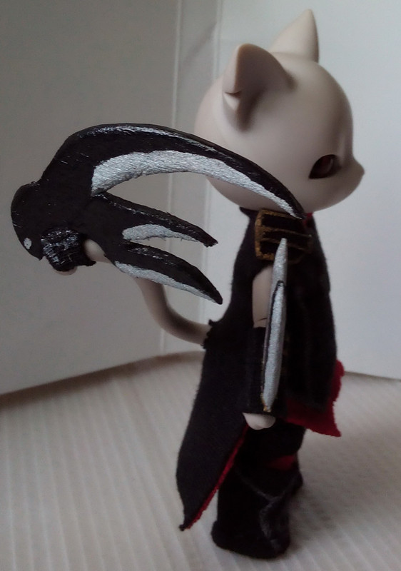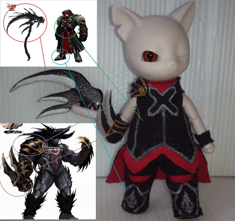 嗯.....娃兒沒衣服穿,所以...12/6號才剛做出來的,是復仇混搭魔化裝,滿意外的~居然槁的出來...,要想.又要縫又要剪又要黏的,想破頭....搞了一整個下午,雖然非常的陽春...,少了帽子,因為....累~~,本來做完狙擊槍就要休息一陣子不做了,雖然...就只差帽子...但...改天在補了,尾巴可拔下當武器(鐮刀),尾巴武器可翻面!?.....沒啥..就可兩邊換套上去......