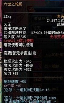 点评:该武器是提升六道轮回这个技能的,当然很多人没有玩,不太清楚这个技能的运作机制,也就是说这个技能配合残影可以瞬间放出12个技能,又提升此技能的等级,可以说残影放出的技能有90%以上的本身技能的百分比,结印时间缩短,提高机动性,高基础也是一亮点,忍者毕业武器之一。