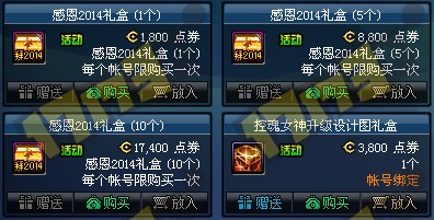 商城内上架2014感恩礼盒,可交易,单账号最多可购买16个
