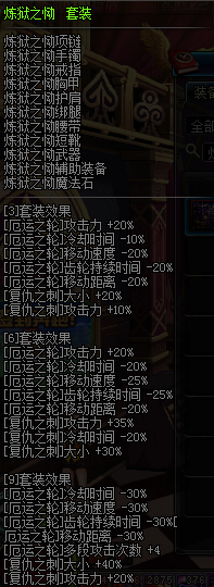 单件装备效果增加[基础精通]效果、减少所有冷却技能时间、增加对敌人的伤害,套装效果增加属性和附加伤害,还有随机重置自身技能的冷却时间,总体提升极大。
