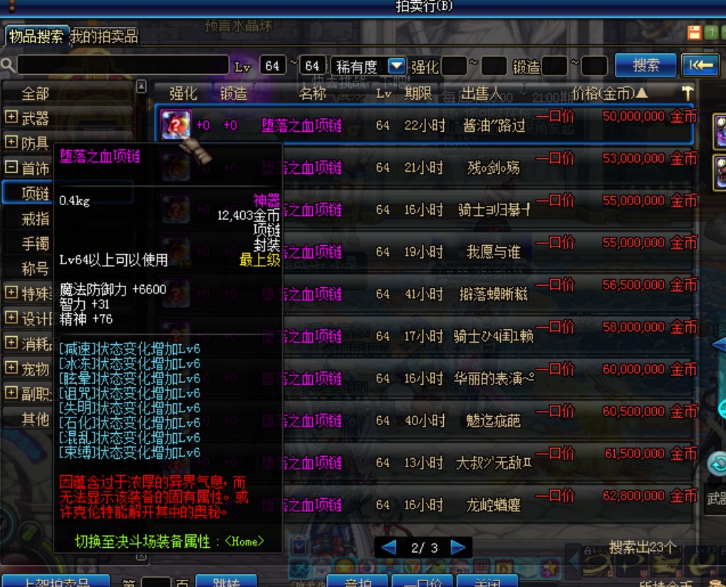 我没在意 然后 又来了个人说要用1个堕落之血项链加1000张挑战书跟我换 我搜了下拍卖行 那项链居然5000W
