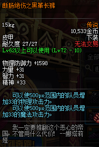 除[使徒化身]外全技能Lv+2的优秀属性,装备的攻速负面效果可以被战斗法师本身或圣骑士提供的Buff弥补。但附加伤害的条件比较苛刻,在安图恩地图中,除非对大局相当有把握的玩家能够控制好血量外,一般玩家很难利用好特效,属于真正高端力法玩家的武器。