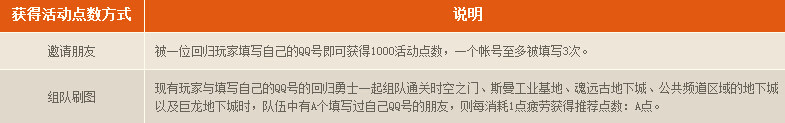 3、请回归玩家一定要记得填写一个QQ号,否则无法获得任何奖励,填写自己QQ号的回归玩家将不能组队通关地下城获得活动点数;