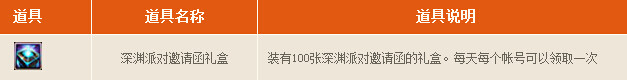 回归勇士和被回归勇士填写过QQ号的现有玩家每天登录游戏获得超过200点活动点数后即可领取1个【深渊派对邀请函礼盒】。