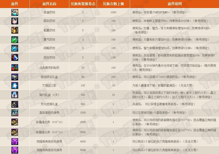 7、在点数商店兑换的道具时,若是物品栏已满,则会以邮件的形式提供物品,物品的保存期限为1天;8回归玩家可以相互推荐,相互推荐后一起组队刷图可以获得双倍推荐点数(推荐以及被推荐组队刷图的点数同时叠加)。