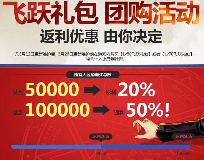 现在【Lv50飞跃礼包】和【Lv70飞跃礼包】的团购总量已满足返还50%代币券的条件,所有已经购买和即将购买两种飞跃礼包的勇士,在4月9日停机维护后,将统一收到我们发放的返利代币。
