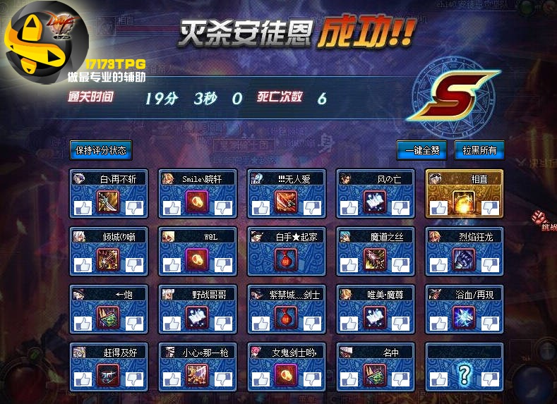 A:在您每次组队通关重要副本(异界、镇魂、安徒恩)之后,我们会有额外的评分界面,您都可以对所有队友进行点赞或拉黑,同时还有一键全赞和一键拉黑所有人的功能。