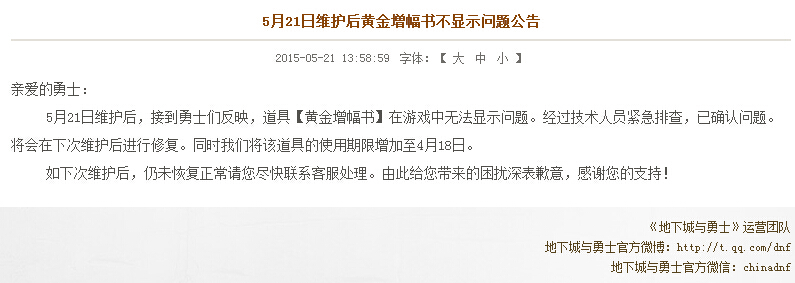 5月21日维护后,接到勇士们反映,道具【黄金增幅书】在游戏中无法显示问题。经过技术人员紧急排查,已确认问题。将会在下次维护后进行修复。同时我们将该道具的使用期限增加至4月18日。(编注:原文即如此)