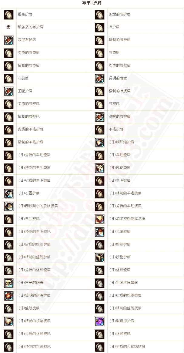 | 赫顿玛尔贵族披肩 | 20 | 混乱抗性+21~24 | HPMAX+150 物理防御+60 所有属性抗性+8 穿刺抗性+20 |