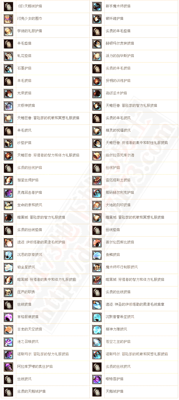| 彗星丝绸披肩 | 35 | MPMAX+91 | 智力+16~24 精神力+19~23 施放速度速度+5% [化现雷光]技能Lv +1 [念气守护]技能Lv +1 |